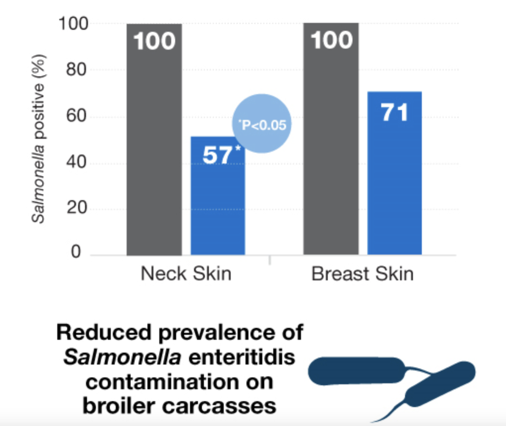 در یک پژوهش ۴۸۰ مرغ هوبارد، ۴۲۰ مرغ کاب و ۳۰۰ مرغ راس ۳۰۸ با سالمونلا تیفیموریوم و سالمونلا انتراتیدیس آلوده شوند. ۱۵۲ نمونه گوشت سینه و گردن جهت اندازه گیری نرخ آلودگی با سالمونلا برداشت شد. تحقیقات نشان داد که استفاده از مخمر زنده باعث کاهش معنی دار تستهای سالمونلا مثبت در لاشه و نمونهها شد. استفاده از مخمر زنده توسط EFSA جهت کاهش سالمونلا در لاشه تایید شده است.