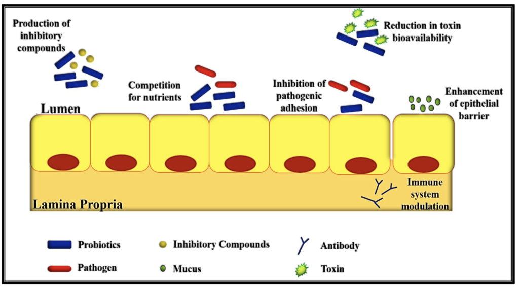 پروبیوتیک ها عموما از روش تاثیرات خود را اعمال میکند. رقابت بر اتصال به دیواره روده و تعدیل سیستم ایمنی. رقابت بر اتصال به دیواره روده شامل: